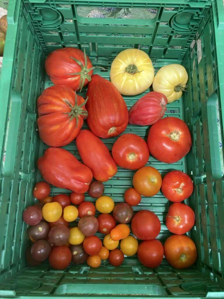 Im Bild links oben seht ihr die gefurchte Sorte Liguria, ihr Aroma ist fruchtig, würzig, süß. Sehr ähnlich aber weniger stark gerippt ist die Sorte Malea. Unverkennbar ist die Sorte White Beauty, rechts oben. Die cremefarbenen Tomaten haben ein zart schmelzendes Fruchtfleisch mit wenig Säure. Die Sorte Fiammante, Bildmitte links, bringt längliche, beutelförmige, leicht gerippte Früchte hervor. Das Fruchtfleisch ist kompakt, frisch und aromatisch. Ausserdem gibt‘s bei den Fleischtomaten noch die Traditionssorte Berner Rosen mit einer rundlichen rosa Frucht.